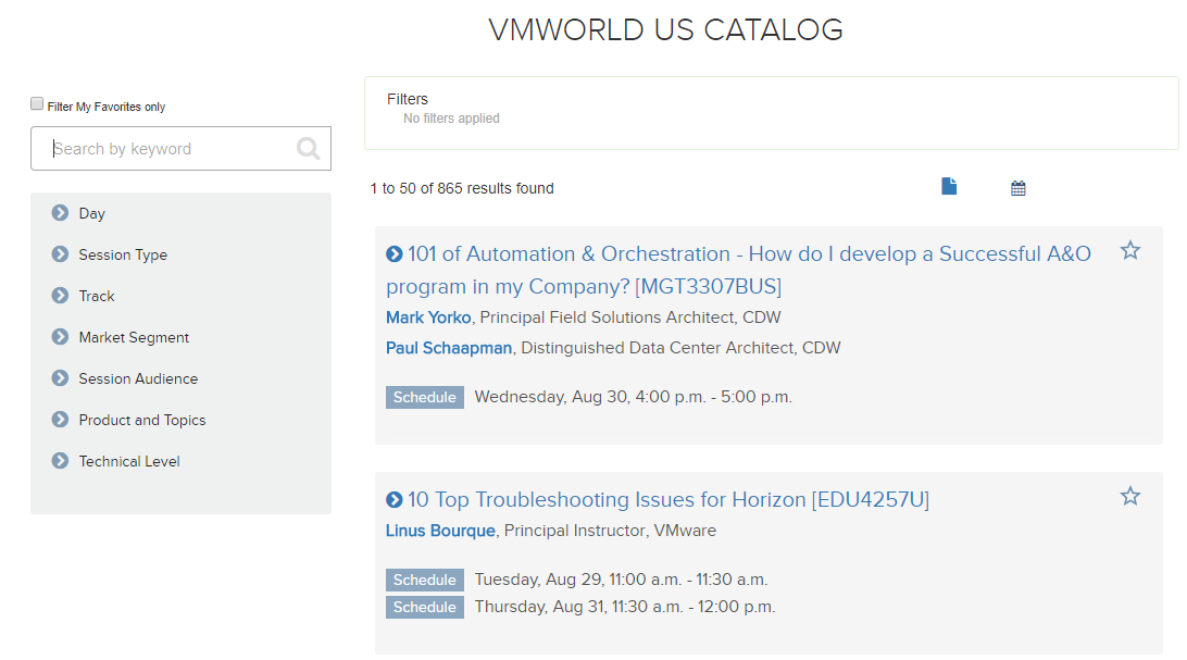 VMware content catalog is available to the public and includes a comprehensive list of breakout sessions, hands-on labs, group discussions and other sessions. Registered attendees and prospective attendees alike use the catalog to check out topics and speakers and find their “sessions of interest.” Registered attendees can use the content catalog’s built-in scheduling feature to pre-register for sessions and begin building out their personal schedules for the week. Because breakout sessions can fill up quickly, we advise pre-registering at your earliest convenience.
